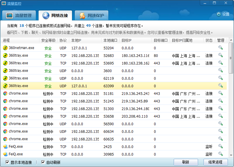3、360流量监控能够检测进程的本地IP端口和目标IP端口,以及IP的归属地,帮助用户更好地了解网络连接情况。