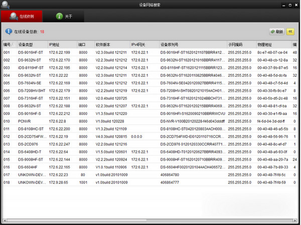 1、采用动态广播扫描技术,自动识别同一局域网内的海康设备(如摄像头、录像机),实时展示设备类型、IP地址、激活状态等核心信息
