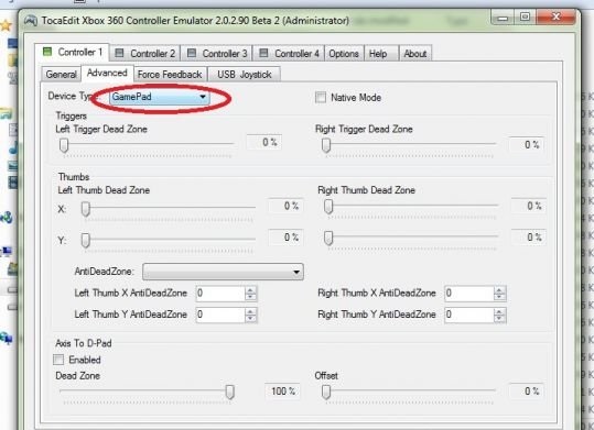 设好按钮和推杆后,把Advanced里的Device Type设定为Game Pad。