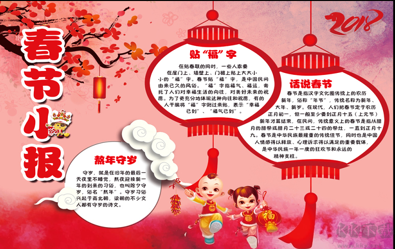 迎接新年春节手抄报模板是一种用于庆祝新年春节的方式。迎接新年春节手抄报模板的设计多种多样,常常以春节的象征物如鞭炮、灯笼、舞龙舞狮、年桃等为主题,还可以包括对新年的祝福、对祖国的热爱、对家人的思念等内容。手抄报模板的制作可以借助电脑图形软件进行设计,也可以通过手工剪贴、涂鸦等方式进行制作。制作者可以根据自己的创意和喜好对模板进行个性化的修改和添加。春节是中国最重要的传统节日,也是中国人民团圆、祈福、迎接新春的时刻。手抄报是一种利用彩纸、贴纸、剪纸等材料手工制作的报纸,以其独特的创意和艺术表达方式受到广大人民的喜爱。
