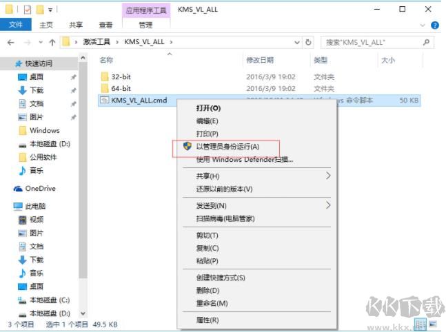 1、下载后解压,然后右键管理员方式运行KMS-VL-ALL.cmd即可。