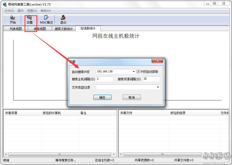 7、设置里面包括了自动搜索IP段,搜索主机间隔、文件类型的过滤等;