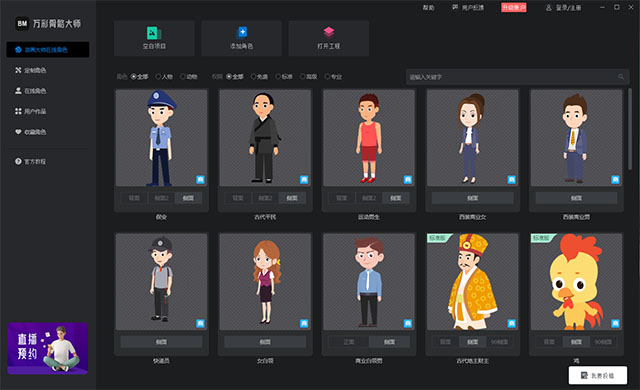 1、支持同时导入多张图片,快速添加骨骼并控制不同姿势与动作,制作协调丰富的角色动画。2、提供大量可商用角色模型、动作模板及个人/企业可商用素材(标注“商”字),定期更新,确保版权合法。