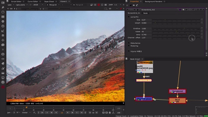 3、用户可以通过连接不同的节点来创建复杂的视觉效果,包括图像合成、颜色校正、键控、粒子效果等。
